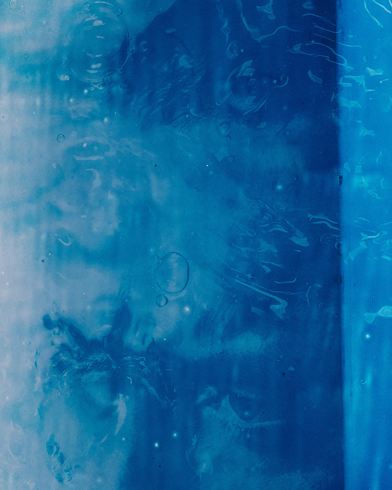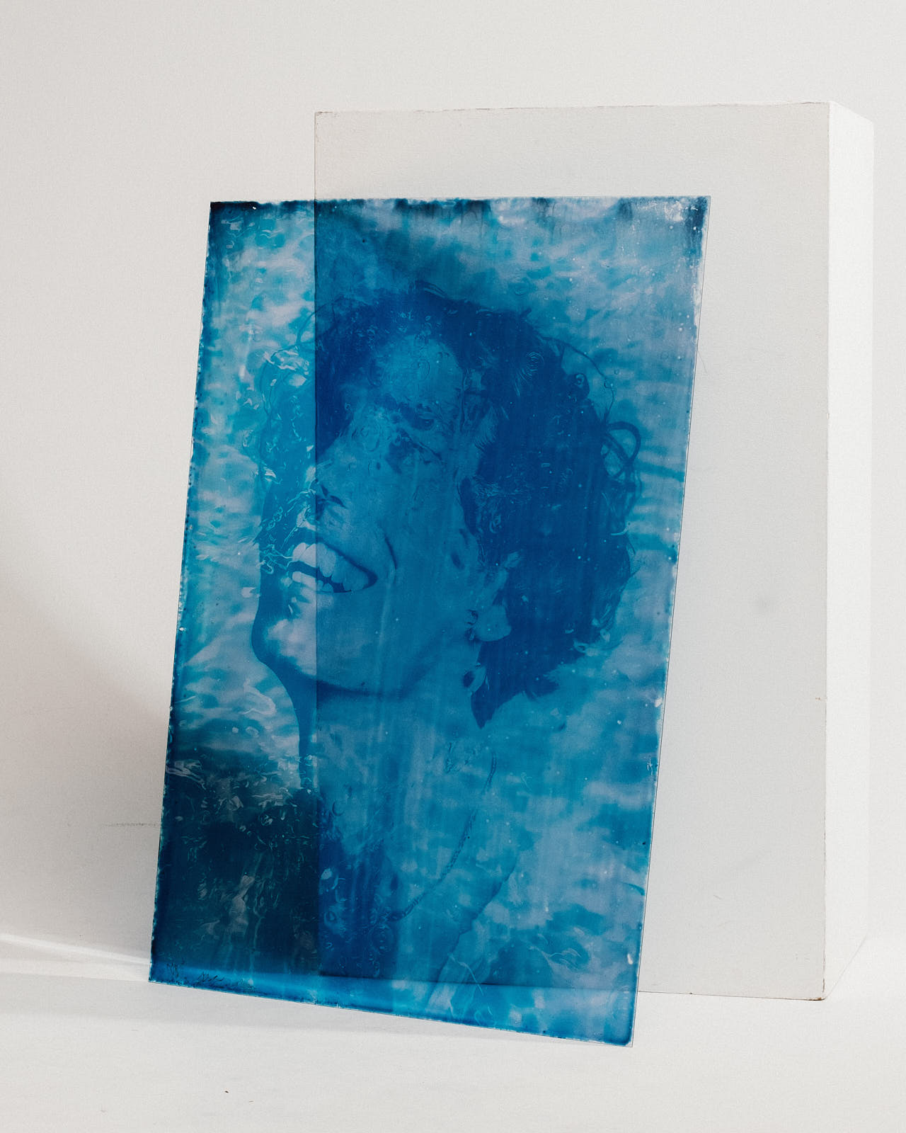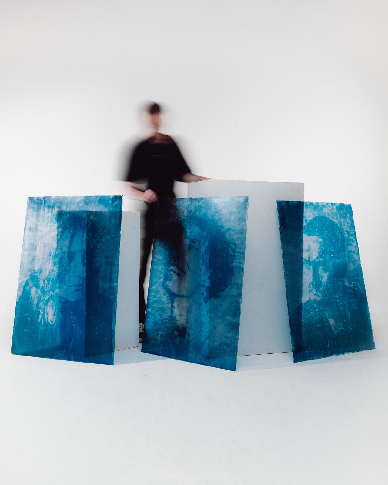 dilution examines the relationship between visibility and concealment. using cyanotype, the work questions photography’s claim to represent reality. transparent, freely suspended portraits reveal which aspects of a person appear, fade, or dissolve within the image. - cyanotypes on plexiglass